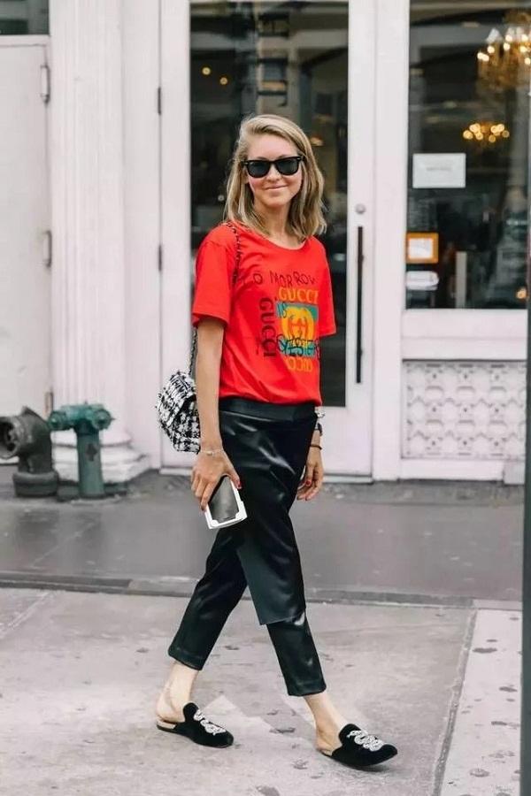 简单的T恤牛仔搭配镶嵌珠宝的黑色羽拖鞋,简约而不简单。整个造型摩登感十足,别有一番风味。